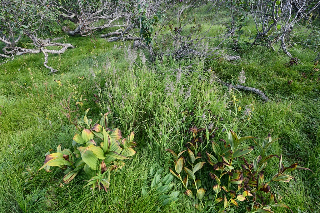 Под ольхой стелется карликовая береза, разные виды трав, в том числе нетипичные для данной местности, например, недоспелка копьевидная, характерная для лесов на юге Сибири. Помимо этого, в арктических «оазисах» появляются ещё около 10-15 видов растений: княженика, вейники, иван-чай, чемерица, синюха и другие. Зимой кустарники удерживают снег, который, как покрывало, отепляет почву. Данные с термодатчиков, установленных в почве, показали: разница температур на участках с растительностью и без неё может составлять 10-15 градусов.