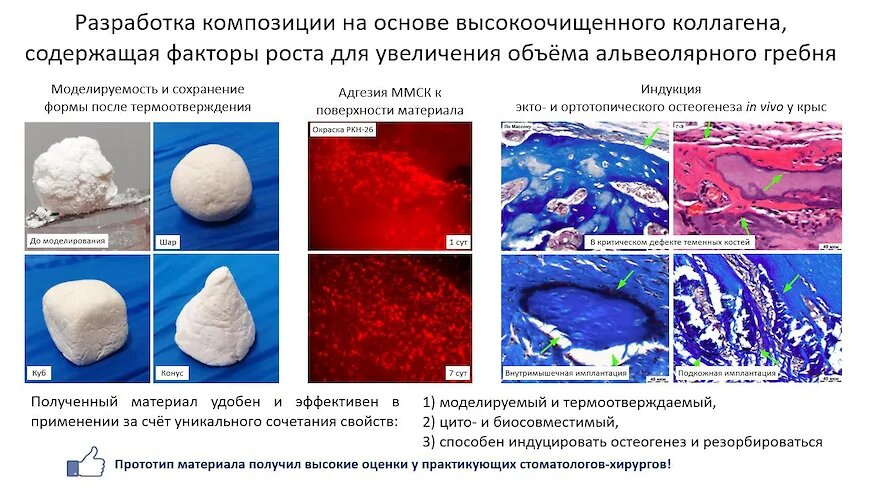 При исследовании на лабораторных животных материал активировал рост костной ткани даже при подкожном и внутримышечном введении, то есть заставлял кость расти в тех условиях, где организм ее не сформировал изначально. При внутрикостном введении в области дефектов черепа и челюстей лабораторных крыс и карликовых свиней материал также способствовал активному росту кости. Проектируемый материал также показал свою эффективность в процессе исследования на выделенных из человека культурах клеток.