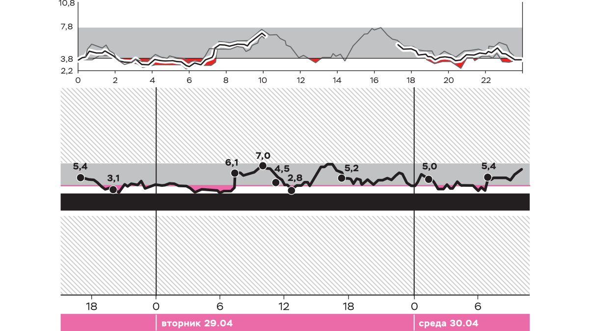Девять паттернов включали эпизоды ночной гипогликемии. В редких ситуациях гипогликемия развивалась вскоре после отхода ко сну. В большинстве случаев гипогликемия наблюдалась в 2–4 часа ночи. При этом уровень глюкозы после полуночи был нормальным, однако наблюдался тренд на понижение. Если уровень глюкозы в начале ночи был повышенным и наблюдался нисходящий тренд, гипогликемия развивалась ближе к утру, в 4–6 часов утра.