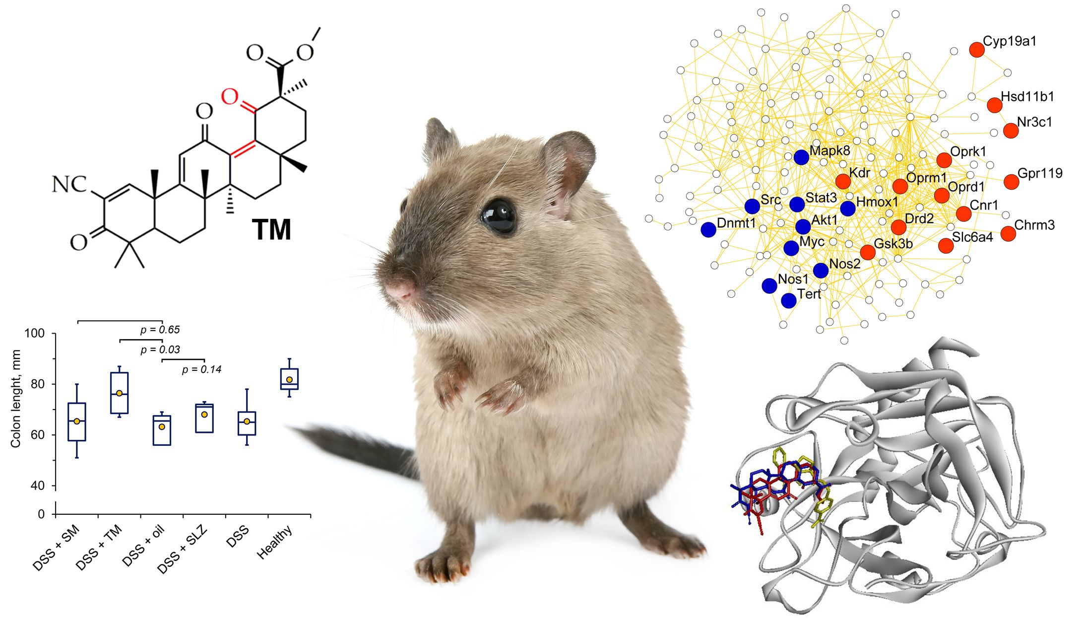Слева сверху — структура триоксолон метила, слева снизу — график длины кишечника — чем он длиннее, тем лучше (при колите длина кишечника сокращается); справа сверху — генная ассоциативная сеть из потенциальных мишеней триоксолон метила (красные и синие круги) и генов, которые связаны с развитием колита (маленькие белые круги); справа снизу — одна из белковых мишеней триоксолон метила (видно, что и триоксолон метил (красная молекула), и солоксолон метил (синяя молекула) попадают при моделировании в сайт связывания известного ингибитора белка (желтая молекула). Рисунок предоставлен исследователями