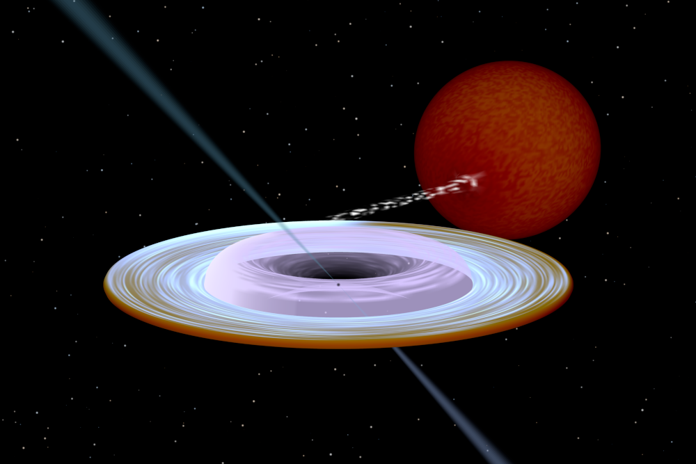 Черные дыры в таких системах образовались в результате космического катаклизма — коллапса массивной звезды. Сейчас мы видим, как черная дыра в системе MAXI J1820+070 увлекает за собой вещество более легкой звезды-компаньона, вращающейся вокруг нее. Масса черной дыры оценивается примерно в 8 солнечных масс, её компаньона — примерно в половину солнечной.