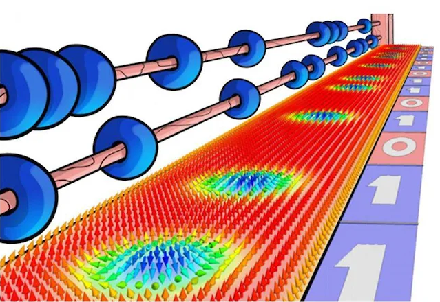 Но мало того, что скирмион топологически устойчив. У него есть два направления закрученности (по часовой стрелке и против часовой стрелки) и два направления спина (вверх и вниз). Всего четыре комбинации. А следовательно, на основе магнитных вихрей возможно создание небулевой четырехзначной логики для обработки сигналов. Но даже и без этого, ввиду субнанометровых размеров магнитных пленок и нанометровых размеров самих вихрей ожидается повышение плотности хранения информации. И наконец, за счет управления движением вихрей можно создавать так называемую «беговую память» (racetrack memory). В жестком диске информация регистрируется с вращающегося элемента, а в запоминающем устройстве нового поколения по неподвижной тонкой проволоке мимо считывателя будут пробегать скирмионы. Это позволит обойтись без механически движущихся частей, что ускорит работу и повысит надежность запоминающего устройства.
