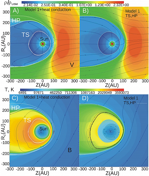 Диаграммы A и B показывают численную концентрацию, диаграммы C и D — температуру солнечного ветра гелиосферы, полученные в результате моделирования с учетом электронной теплопроводности (A и C) и без неё (B и D). Картинка дана в экваториальной плоскости, т.е. мы смотрим на Солнце со стороны полюса. Белой сплошной линией показаны форма гелиосферной ударной волны и гелиопаузы для модели с учетом электронной теплопроводности, пунктирной линией — без её учёта. Расстояния даны в астрономических единицах (а.е.)