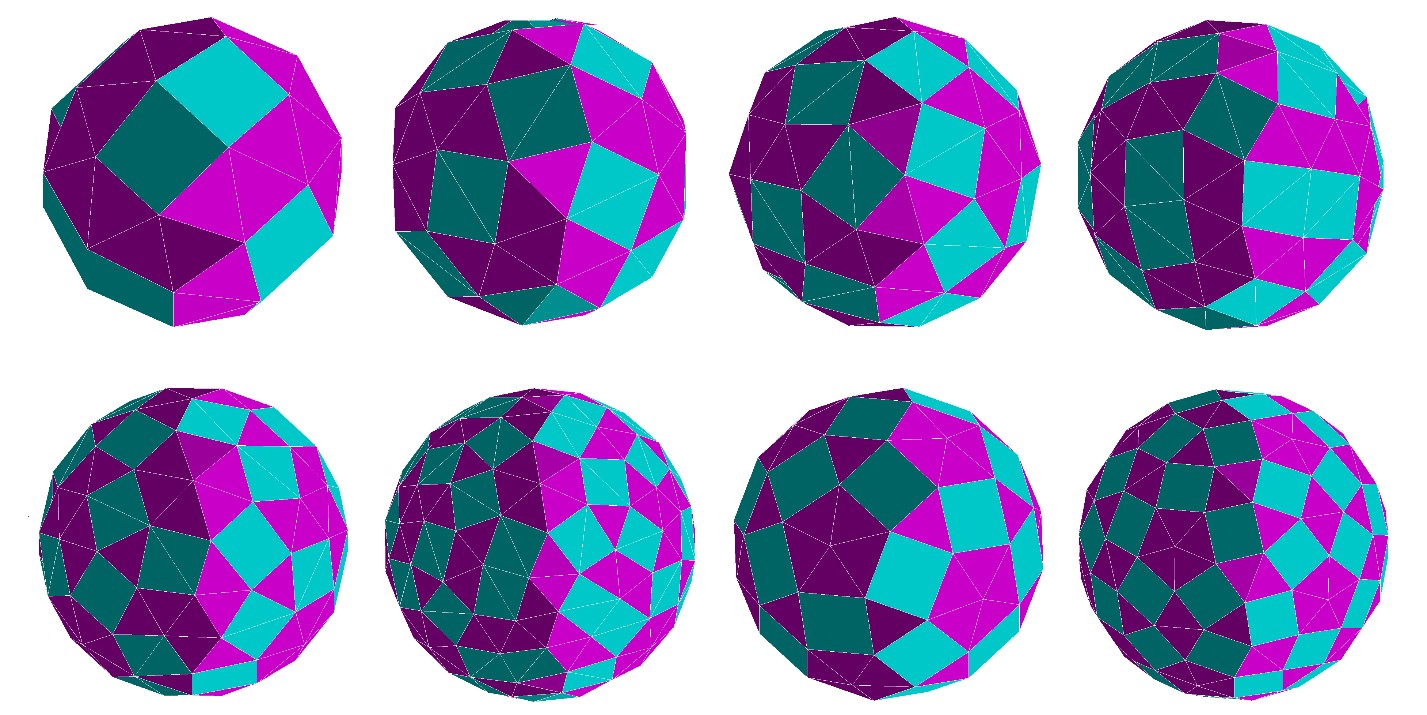 Модели треугольно-квадратных оболочек с разным числом вершин (от 36 до 138). Источник: Rochal et al. / Physical Review X, 2024