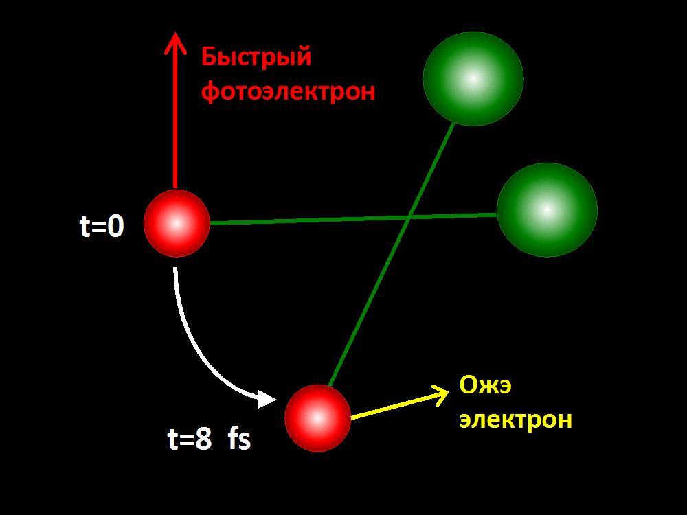 Кроме того, авторы определили угол этого поворота с помощью оже-электрона, выбившегося из молекулы на восемь фемтосекунд позднее. Оже-электроны — это частицы, которые вылетают из молекулы, как только на одной из ее внутренних оболочек появляется свободное место. Варьируя энергию рентгеновского фотона и, как следствие, скорость вызванного вращения, ученые смогли отобразить на экране динамику этого вращения.
