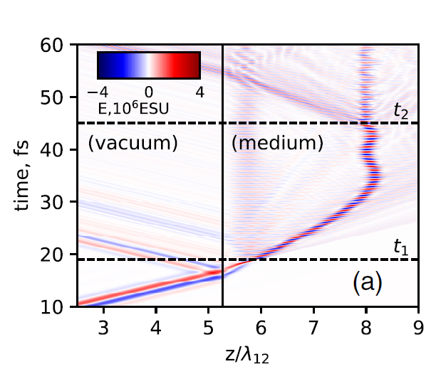 Эволюция поля короткого импульса, входящего в резонансную среду: световой импульс «останавливается» около точки с координатой z ≈ 8λ12. Здесь λ12 — длина волны резонансного перехода в среде. Источник: Arkhipov et al. / Physical Review Letters, 2022