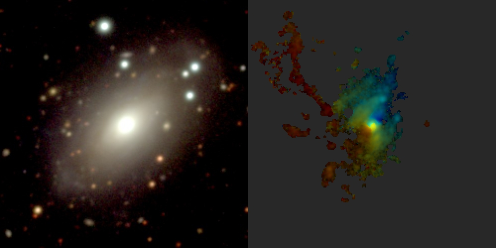 Фото: глубокое оптическое изображение галактики Mrk 6, полученное с помощью 6-метрового телескопа САО РАН и распределение ионизированного газа в том же масштабе (цвета соответствуют разным скоростям движения газа относительно наблюдателя). Источник: Алексей Моисеев.