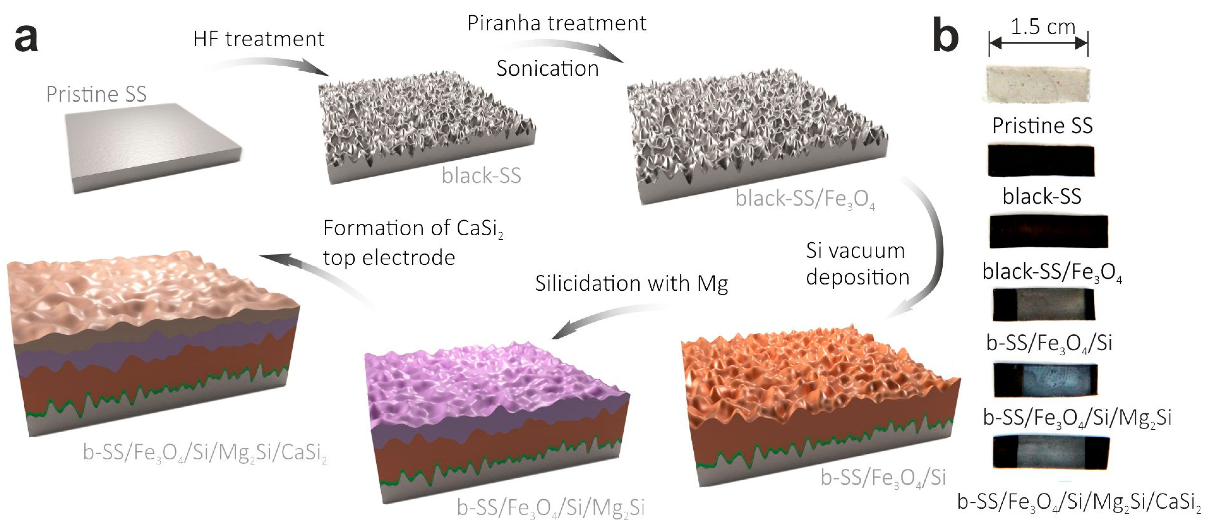 Ученые из Института автоматики и процессов управления ДВО РАН (Владивосток), Дальневосточного федерального университета (Владивосток) с коллегами из Университета Токай (Япония) предложили новый метод нанесения тонких слоев кремния и силицида магния на текстурированную стальную подложку. Он позволил получить солнечный элемент с эффективностью преобразования света в ток около 7,5%, что сопоставимо с показателями солнечных батарей, изготавливаемых на подложках из других материалов. Так, авторы сначала текстурировали образцы стали фтороводородной кислотой, то есть придали им определенный рельеф, чтобы получить антиотражающую поверхность и защитную пленку из оксида железа. Далее на нее в вакуумной камере наносились светопоглощающие слои кремния и силицида магния, а также верхний проводящий слой дисилицида кальция.
