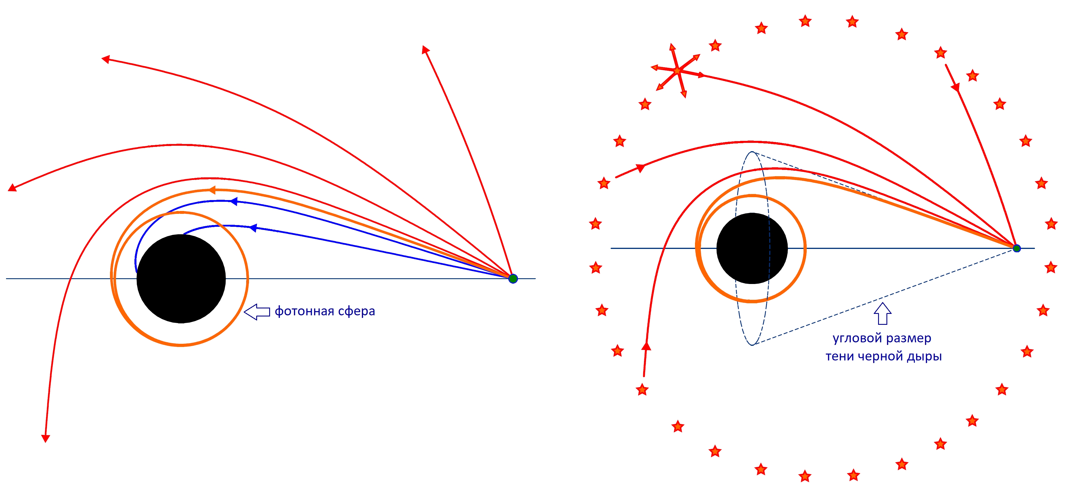 Справа: теперь предположим, что существует множество источников света, распределенных со всех сторон вокруг черной дыры. Каждый источник света испускает световые лучи во всех направлениях, и некоторые из этих лучей достигают наблюдателя. Хотя возможны очень разнообразные траектории световых лучей от источников к наблюдателю, ни один из лучей, достигающих наблюдателя, не может пройти через область, заполненную лучами второго типа (синие лучи на левой картинке). Следовательно, конус, ограниченный световыми лучами, которые спиралевидно движутся к фотонной сфере, будет пустым (темным), поэтому наблюдатель увидит в небе черный диск — тень черной дыры. Рисунок О.Ю. Цупко