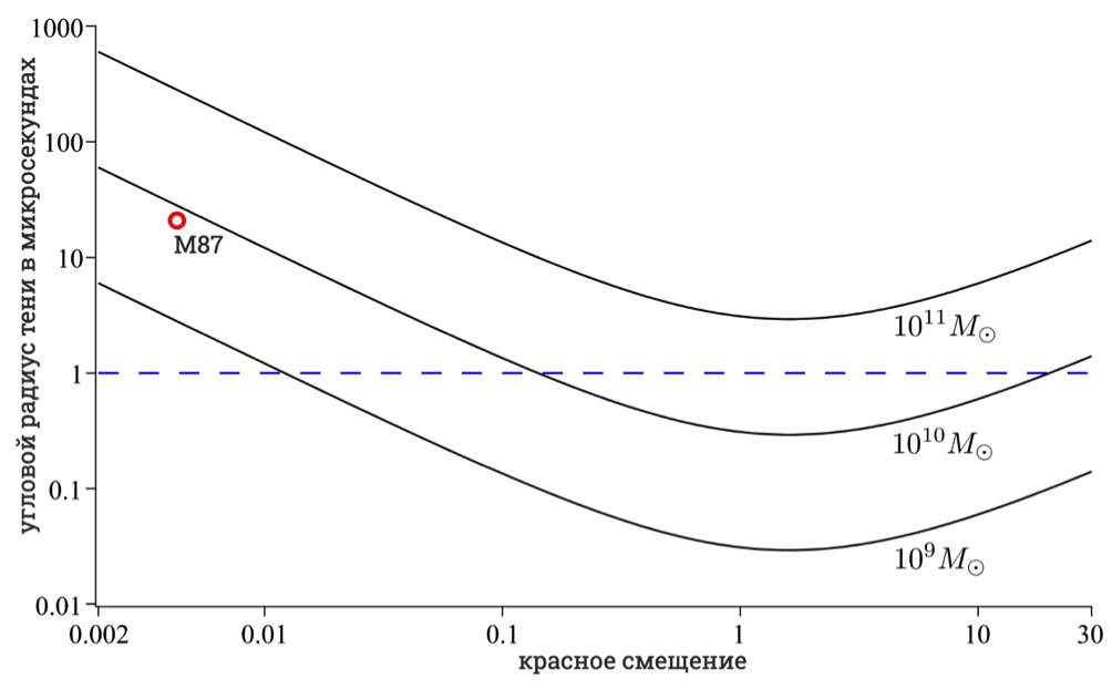 Ожидаемый угловой размер тени черной дыры с учетом влияния расширения Вселенной в зависимости от красного смещения. Черными сплошными линиями показаны кривые для трех разных масс. Кривые вычислены для современного набора космологических параметров. Из рисунка видно, что на больших красных смещениях угловой размер тени начинает увеличиваться и может достигать размеров тени в галактике M87 (показан для сравнения красным кружком). Рисунок О.Ю. Цупко