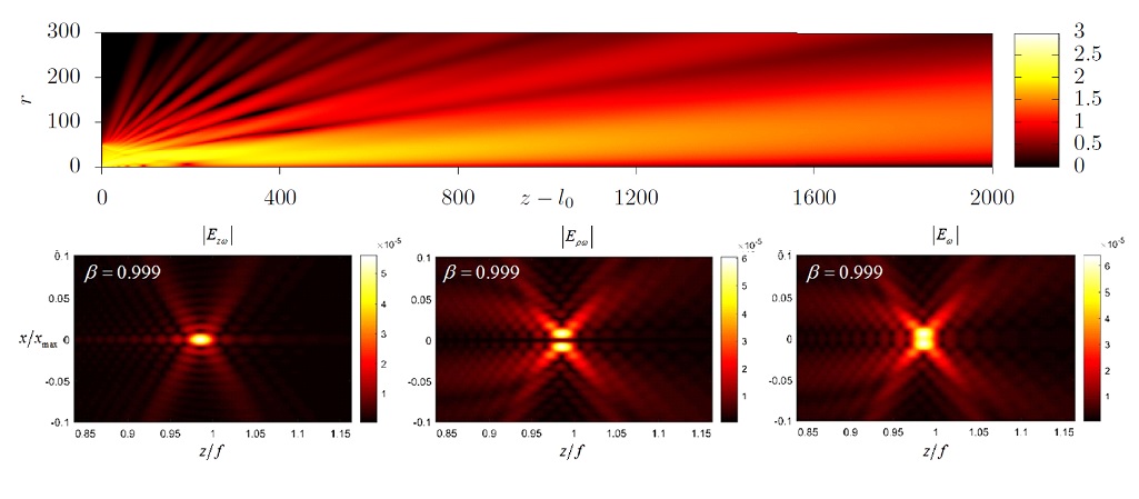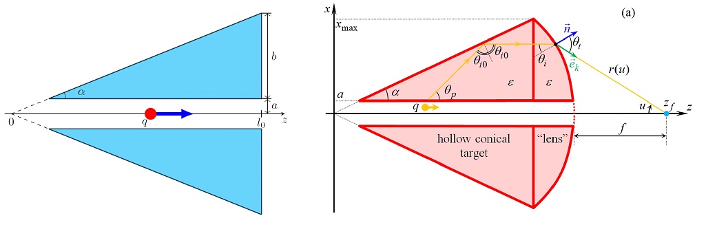 «В наших последних работах с помощью описанного выше метода проанализировано излучение Вавилова—Черенкова при пролете заряда сквозь тонкий канал в конической диэлектрической мишени в направлении от носика к основанию. В первом случае выходная поверхность является плоской. Теория предсказывает, что при определенных параметрах черенковские волны выходят из мишени параллельно оси структуры и согласованно, то есть когерентно складываются в волновой зоне — так возникает эффект “черенковского прожектора” — явление резкого увеличения интенсивности при малых углах наблюдения. Во втором случае выходная поверхность имеет форму гиперболической линзы, что позволяет сфокусировать черенковские волны в малой окрестности заданной точки, расположенной на оси структуры на конечном расстоянии от нее. Мы назвали такую мишень “концентратором излучения Вавилова—Черенкова”. Существенными преимуществами обеих рассмотренных мишеней является возможность концентрации излучения от релятивистских частиц и высокая стабильность системы по отношению к смещению траектории с оси канала»,— отмечает Сергей Галямин, руководитель проекта по гранту РНФ, кандидат физико-математических наук, доцент кафедры радиофизики физического факультета СПбГУ.