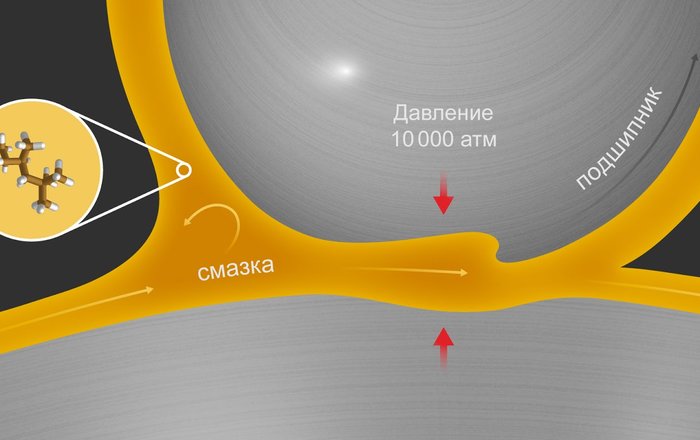 Компьютерное моделирование промышленных жидкостей — важная альтернатива экспериментам. Немногие лаборатории в мире могут позволить себе реальные измерения при давлении до 10 тысяч атмосфер. Между тем такие значения достигаются, например, в подшипниках (рисунок 1) и зубчатых передачах паровых турбин и двигателей самолетов. Поэтому индустрии нужны данные о том, как технические жидкости ведут себя в таких условиях. «Компании стремятся получать быстрые результаты, перебирая варианты веществ не в лаборатории, а в компьютерных симуляциях, — поясняет Кондратюк. — Это особенно важно при дизайне смазок, когда перебирают сотни комбинаций разных смазочных веществ. Производителям выгоднее не держать большой штат ученых, а собирать данные об успешности разных моделей в рамках таких конкурсов и использовать их в расчетах».