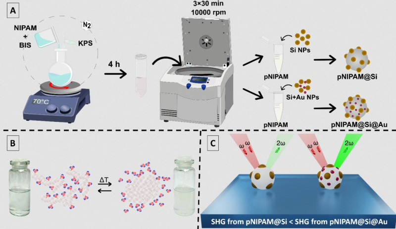 Дорожная карта проведенного исследования. A — схема синтеза микросфер pNIPAM (серый), модифицированных либо наночастицами кремния (желтый), либо наночастицами золота (красный) и кремния. B — иллюстрация фазового перехода pNIPAM. C — усиление второй оптической гармоники для pNIPAM, модифицированного кремниевыми наночастицам, и pNIPAM, модифицированного кремниевыми и золотыми наночастицами. Изображение предоставлено авторами исследования.