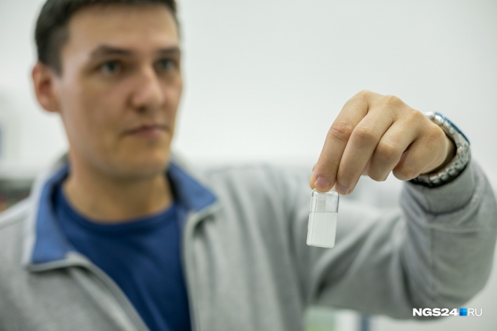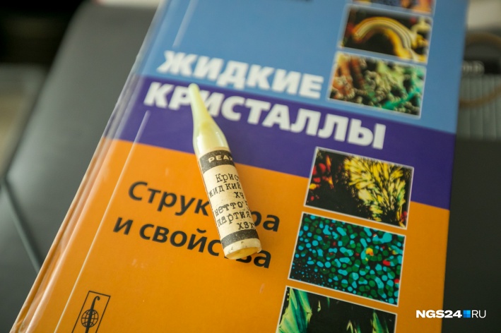 Старший научный сотрудник Института физики Михаил Крахалев показывает нам запаянную ампулу с МББА — это жидкие кристаллы. Мы ожидали увидеть что-то блестящее и сверкающее, но оказывается, что жидкие кристаллы — обычная мутная жидкость желтоватого цвета. При заморозке она превращается в кристаллы, а при повышении температуры — становится прозрачной и вязкой, как растительное масло.