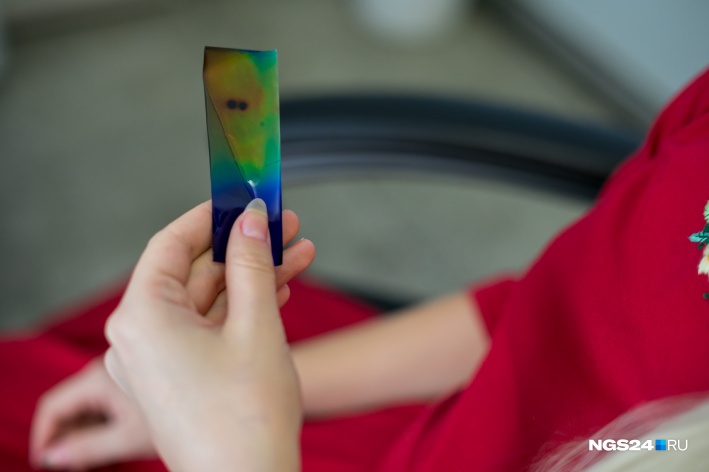 А вот еще один вариант использования вещества — из него получаются хорошие термодатчики. Жидкие кристаллы-холестерики могут менять цвет при изменении температуры. Ученый показывает нам тонкую пленку, которая при соприкосновении с руками моментально меняет свой цвет с коричневого на синий. Выглядит волшебно. И очень знакомо.