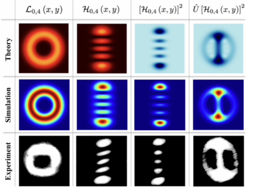 Световая «гребенка» создается в несколько этапов. Лазерный луч от фемтосекундного лазера проходит через специальную дифракционную решетку с топологическим дефектом, становится вихревым пучком и приобретает новый параметр — проекцию орбитального углового момента. Получившийся пучок похож не на сплошное круглое пятно, а на «бублик». Затем он меняет тип моды (состояния электромагнитного поля) в первом конвертере и проходит через нелинейный кристалл. Благодаря этим двум преобразованиям форма «бублика» плавно переходит в набор упорядоченных точек, как будто их прочесали расческой, частота вихревого пучка удваивается, и одновременно с этим в пучке увеличивается количество компонентов с проекцией орбитального углового момента. В этот момент структура пучка фиксируется и становится устойчивой к искажениям. Последний конвертер преобразует набор точек в настоящую световую «орбитальную гребенку», напоминающую свиной пятачок, с разными значениями проекций орбитального момента. Они не взаимодействуют друг с другом, и каждая проекция передает свою часть информации независимо.