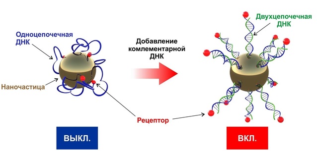 Рисунок 2: активация рецептора на поверхности наночастиц при добавлении комплементарной нити ДНК. Источник: пресс-служба МФТИ