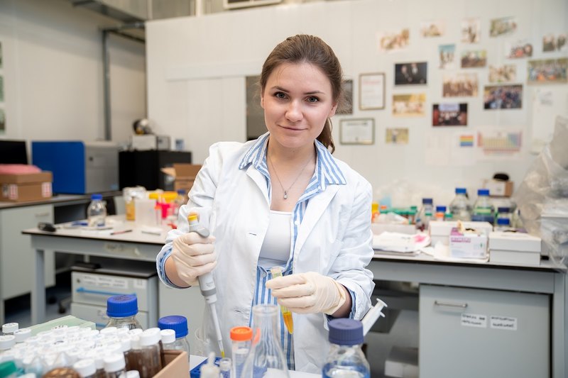 Фото: Елизавета Мочалова, аспирантка МФТИ, готовит образцы для проверки эффективности распознавания раковых клеток созданными наноагентами. Источник: Евгений Пелевин, пресс-служба МФТИ