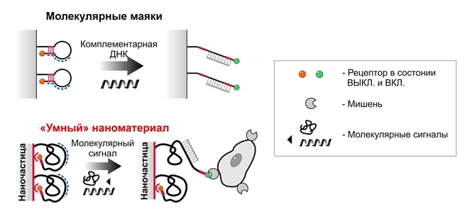 Рисунок: сравнение молекулярных маяков и разработанных авторами исследования умных материалов. Источник: пресс-служба МФТИ