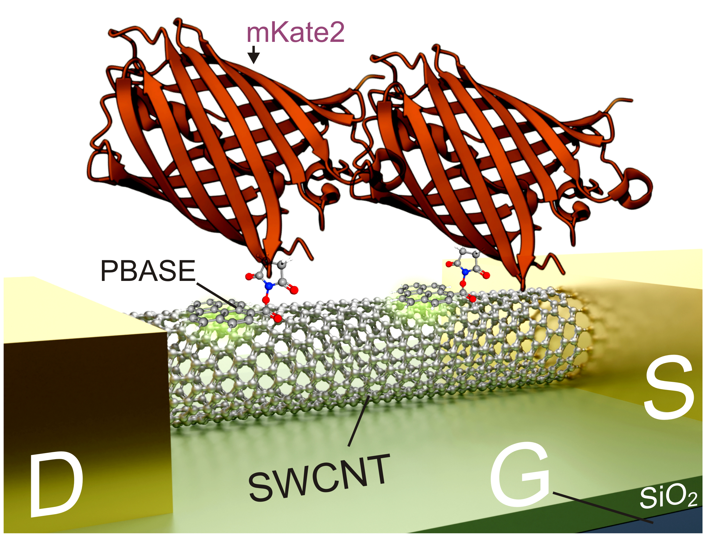 Модель полевого транзистора на основе одиночной углеродной нанотрубки с пришитыми флуоресцентными белками. Источник: Kudriavtseva et al. / Advanced Electronic Materials, 2024