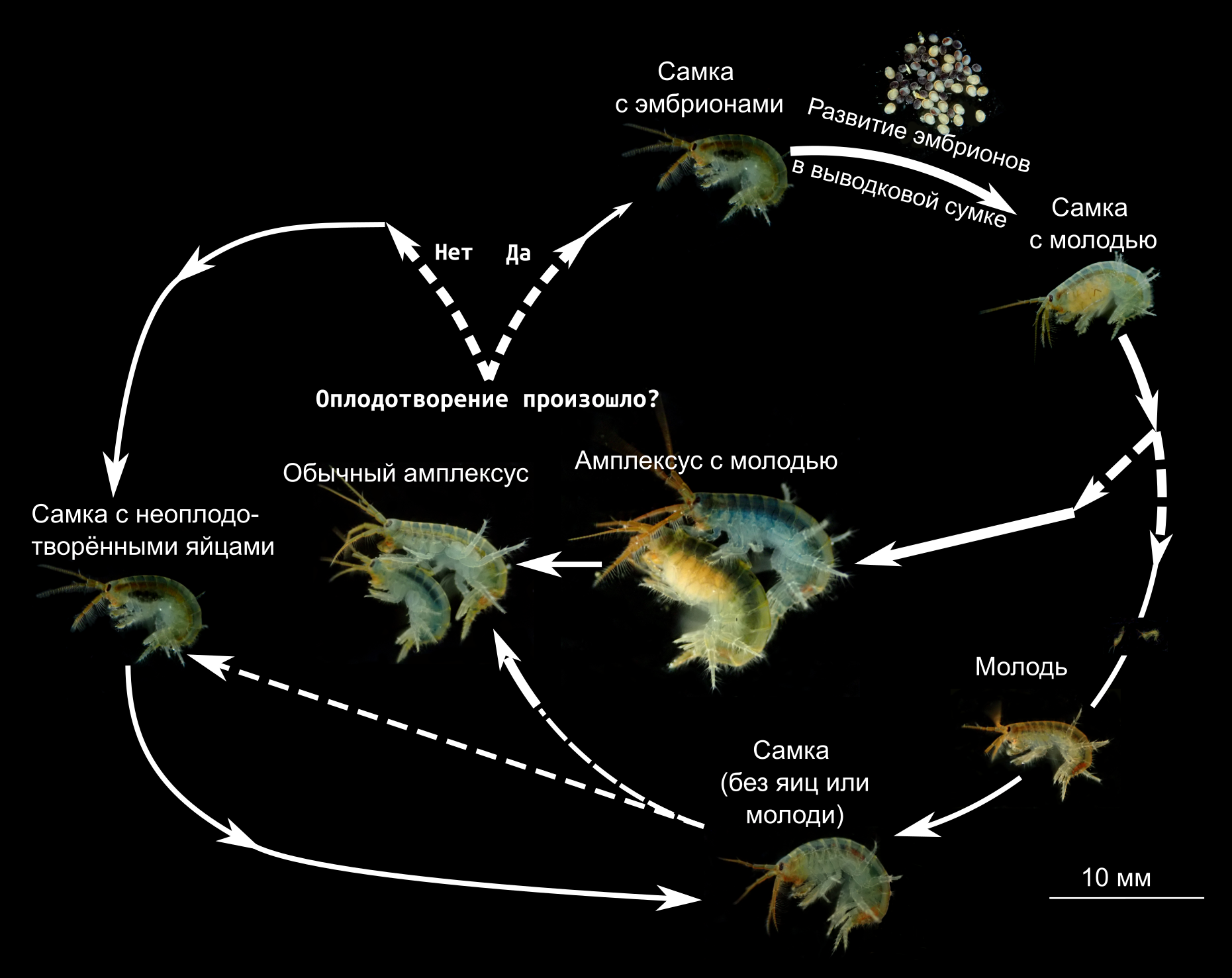 Сложный жизненный цикл объекта исследований — байкальского рачка Eulimnogammarus cyaneus. Источник: Полина Дроздова