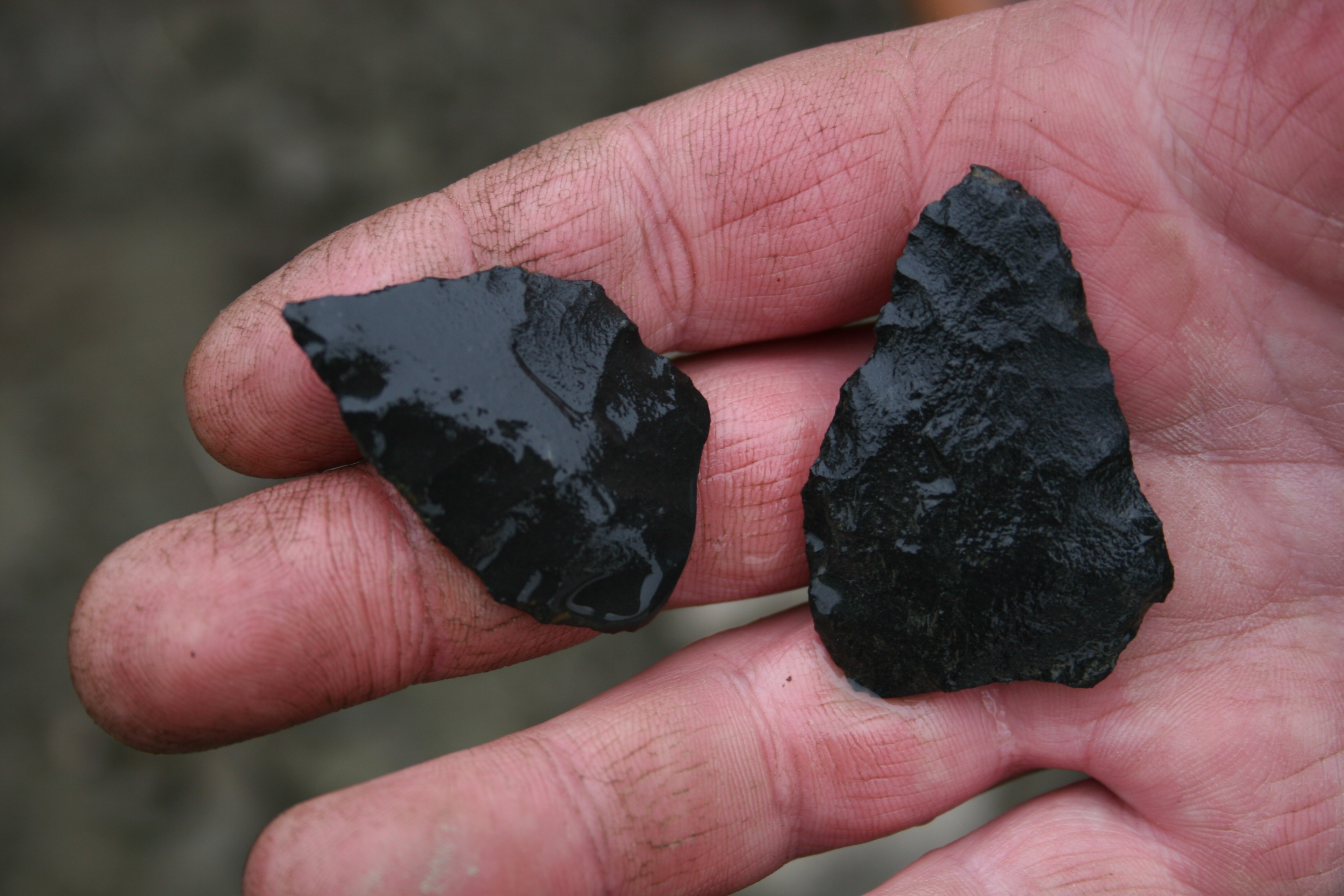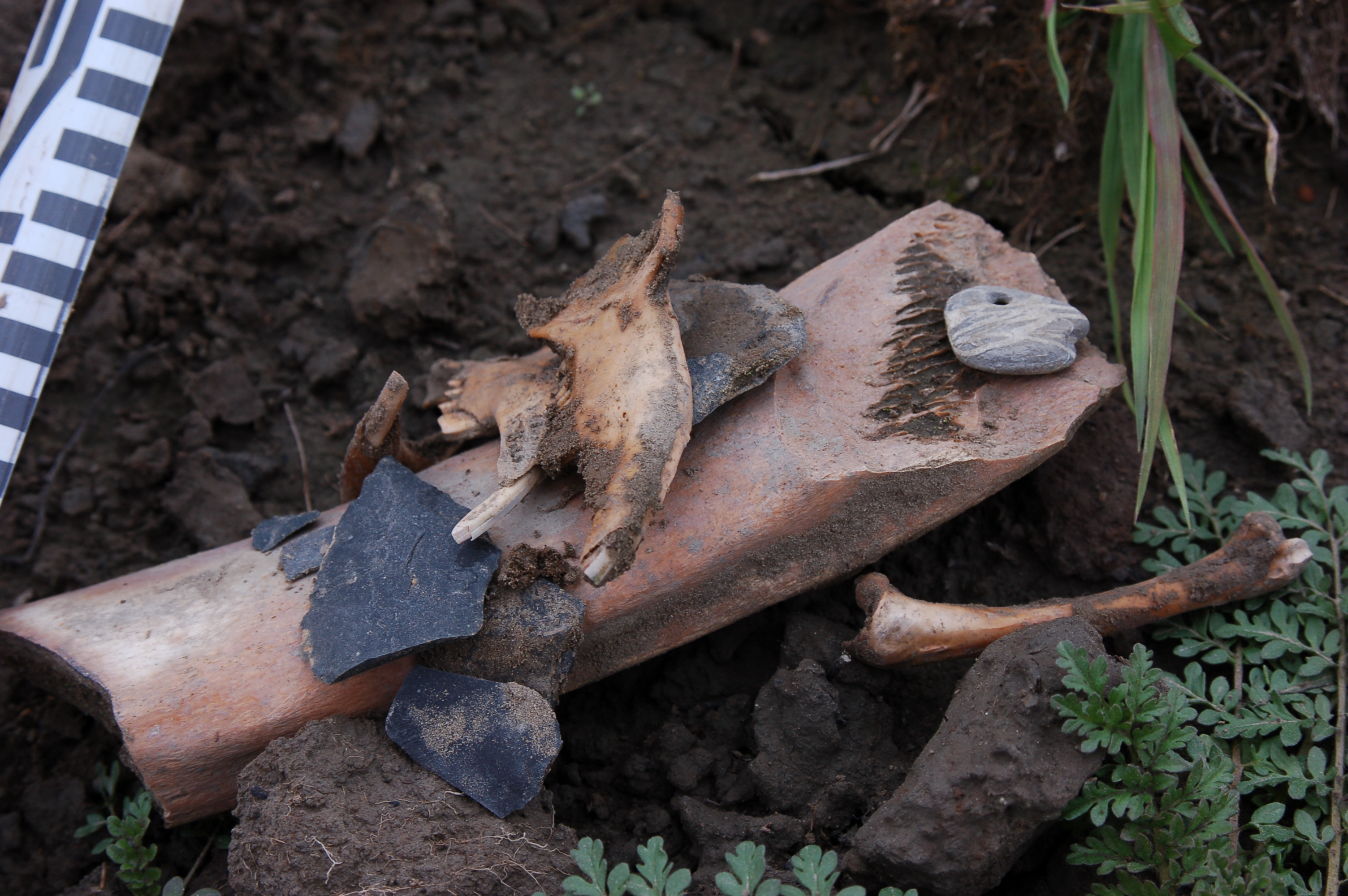 Предметы из осыпи культуросодержащего горизонта: подвеска, острие, отщепы, челюсти зайцев, орудие из ребра мамонта. Источник: Владимир Питулько