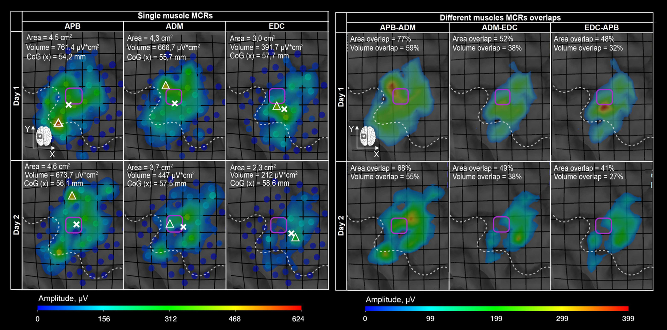 Добровольцы проходили два сеанса картирования с помощью нТМС с интервалом в 5-10 дней. Ученые фиксировали сокращения трех мышц, управляющих движениями кисти и пальцев. Так им удалось получить ТМС карты мышц на двигательной коре. Анализ показал, что обычно используемые показатели, такие как площади, объемы и центры тяжести, имеют высокую относительную и низкую абсолютную достоверность. Первая оценивает результаты повторных измерений, а вторая — изменение данных для одного испытуемого. У перекрытий между ТМС картами разных мышц была высокая абсолютная воспроизводимость, что позволило отследить взаимодействия между этими картами.