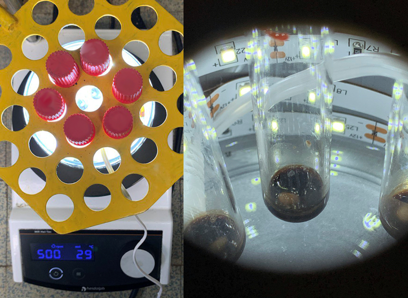 Авторы решили проверить, можно ли сделать так, чтобы реакция протекала при комнатной температуре и при обычном солнечном свете. Для этого исследователи дополнительно вносили в смесь исходных веществ и катализатора различные органические добавки, в том числе фторсодержащие, которые помогают стабилизировать промежуточные продукты химических превращений. Раствор оставляли под лампой белого света на период от 1 до 24 часов.