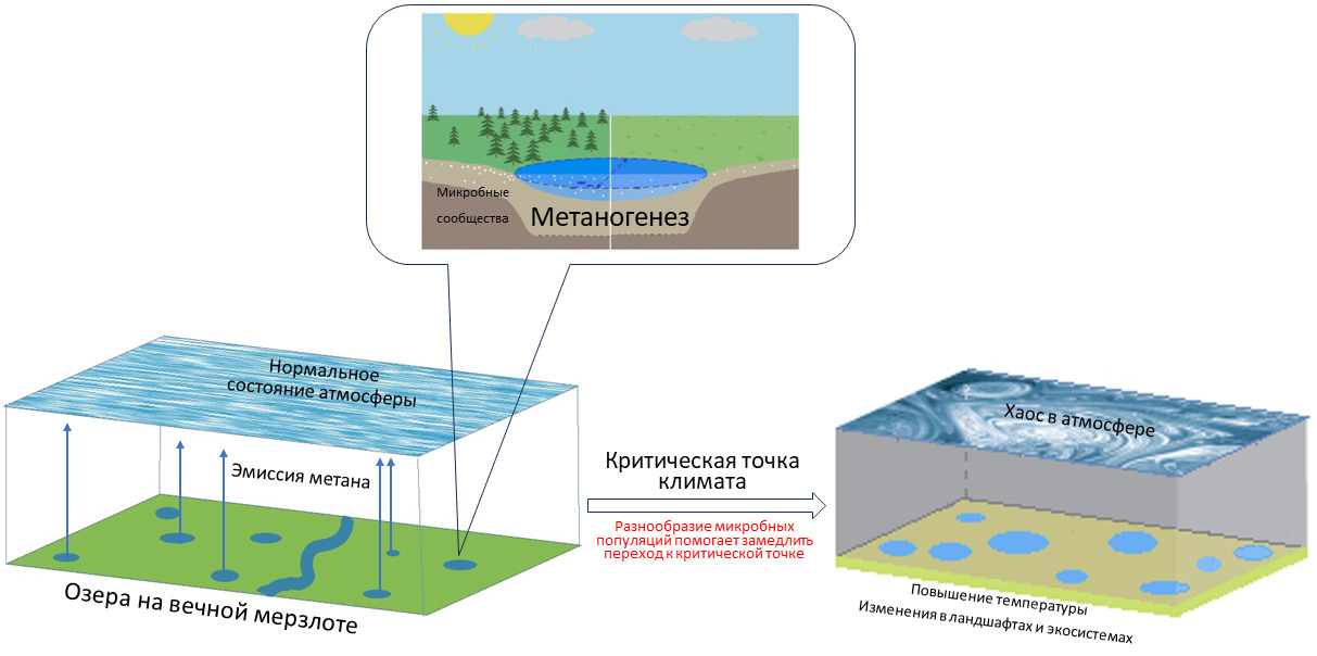 Исследователи из ООО «Центр научных исследований и разработок» (Великий Новгород), Санкт-Петербургского государственного университета промышленных технологий и дизайна (Санкт-Петербург), Института проблем машиноведения РАН (Санкт-Петербург) с коллегами из Калифорнийского университета (США) и Говардского университета (США) проанализировали, как число видов почвенных микроорганизмов влияет на скорость таяния вечной мерзлоты и темпы потепления. Авторы использовали математическую модель Гуди, имитирующую динамику атмосферы планеты. Согласно ей, атмосфера рассматривается как набор отдельных ячеек, в которых циркулирует воздух: внизу — у поверхности Земли — он нагревается, после чего поднимается вверх, далее охлаждается и вновь возвращается к Земле. Чтобы понять, как на эту систему влияет метан, выделяемый микроорганизмами вечной мерзлоты, авторы расширили модель Гуди, введя в нее математические функции, которые описывают поступление синтезированного бактериями парникового газа.