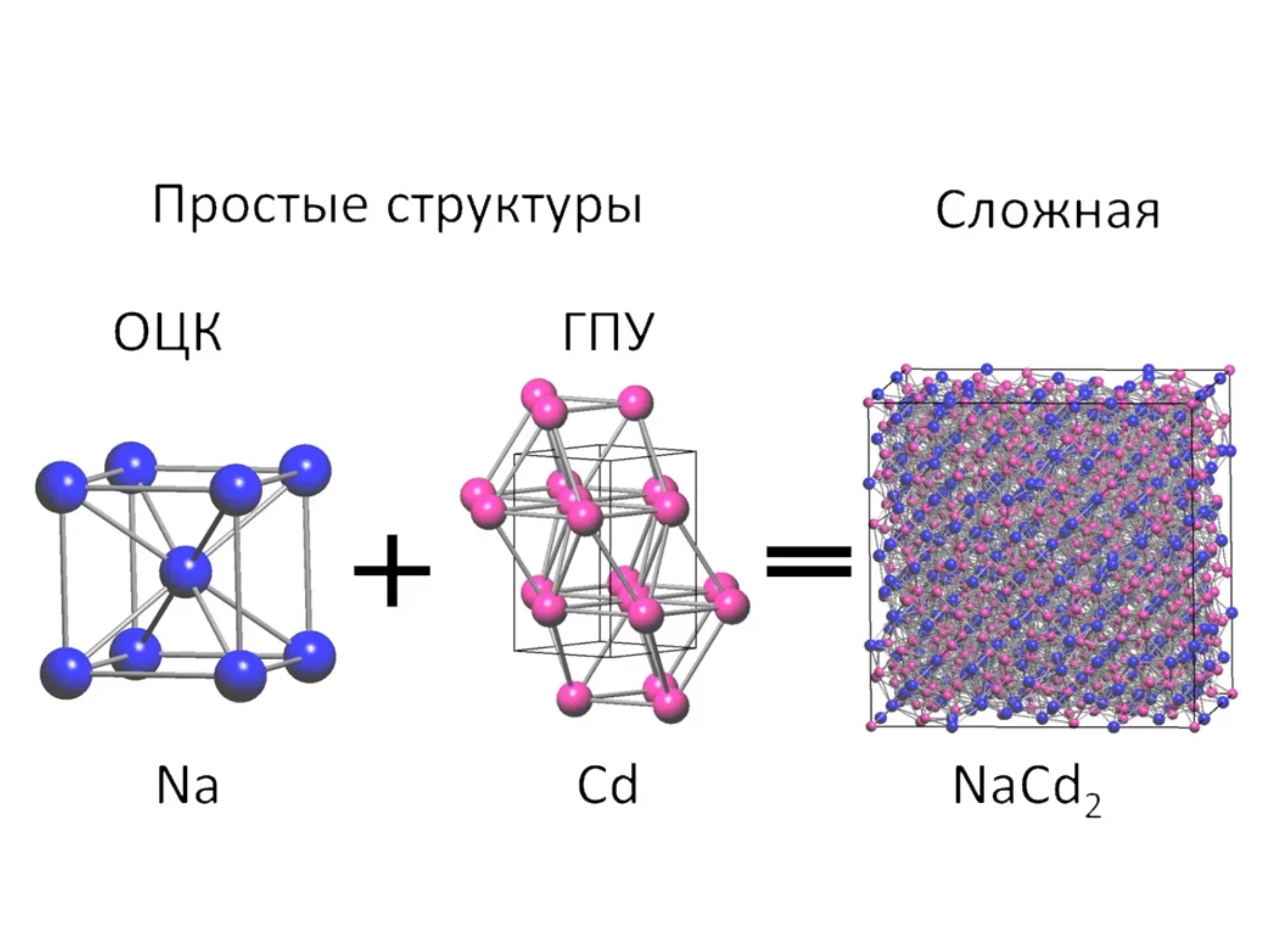 Согласно предложенной модели, именно в них при формировании интерметаллида встраиваются атомы другого металла. Таким образом, формирующаяся сложная структура из нескольких типов атомов сохраняет в себе черты более простой решетки исходного металла.