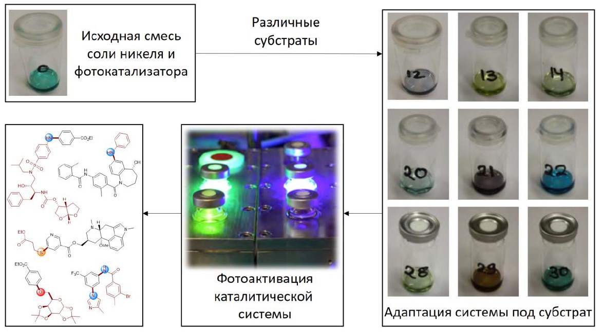 Исследователи из лаборатории металлокомплексных и наноразмерных катализаторов Института органической химии имени Н.Д. Зелинского (Москва) и Регенсбургского университета (Германия) предложили универсальную каталитическую систему, в которой нет дорогих или редких компонентов. В основе — простейшие соли никеля и дешевая фотоактивная добавка. Настроить каталитические свойства удалось под действием видимого света (то есть не нужны дорогие лазеры или мощные ультрафиолетовые лампы) при помощи повсеместно используемых органических оснований – особых органических «адаптеров». Последний компонент системы — субстрат, то есть реагент, из которого будет синтезироваться продукт. Все три компонента находятся в одном состоянии, жидком, — такой катализ называется гомогенным.