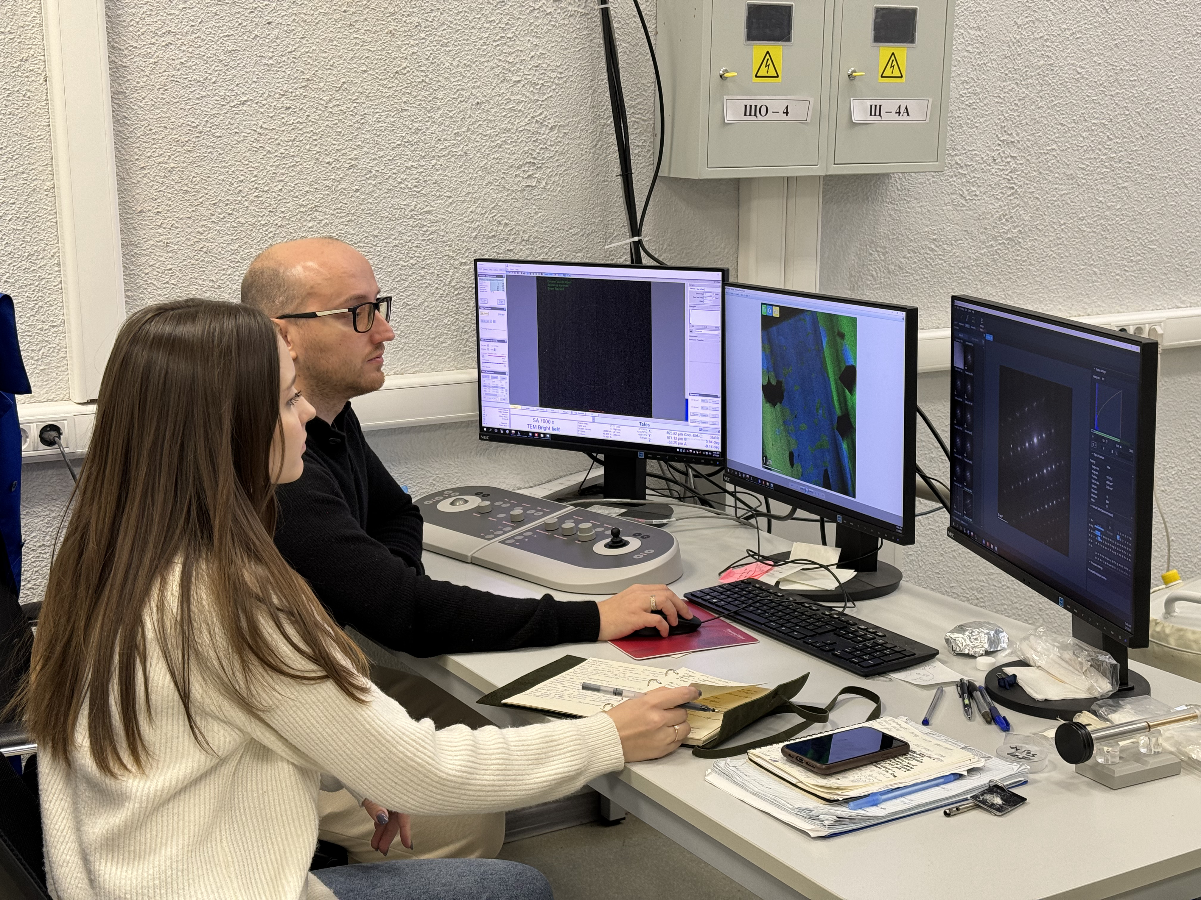 Никита Юрченко и Евгения Панина исследуют структуру оксидного слоя сплава ниобия, титана и хрома на просвечивающем электронном микроскопе. Источник: Никита Юрченко
